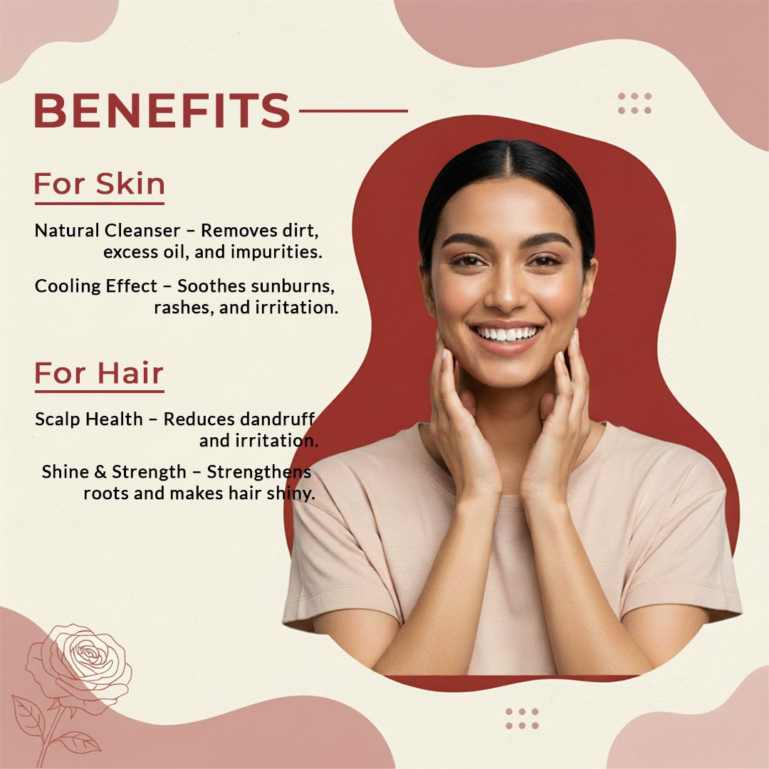 Rose Petals Powder hydrates, softens, and refreshes the skin while enhancing your natural rosy glow. It tightens pores, reduces dullness, and promotes smoother, youthful-looking skin.